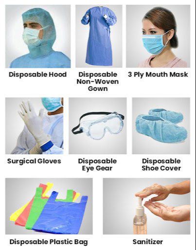 Includes hood, gown, 3-ply mask, gloves, eye gear, and sanitizer.